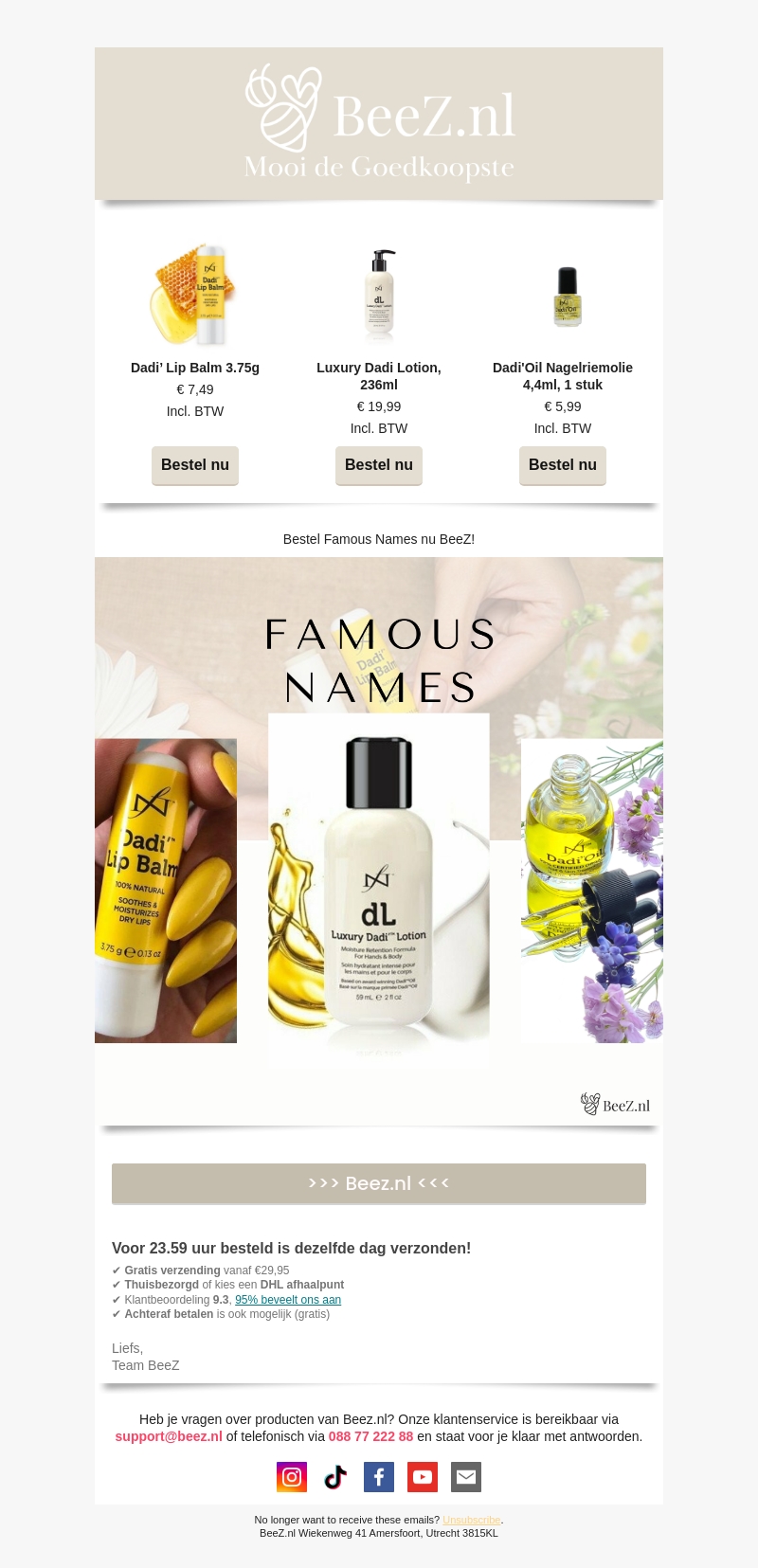 Bestel nu de populaire Dadi' producten bij BeeZ.nl. Of je nu op zoek bent naar een verzachtende lippenbalsem, een luxe lotion of nagelriemolie, BeeZ heeft het allemaal. Alle producten zijn beschikbaar tegen aantrekkelijke prijzen. Morgen in huis als je vóór 23.59 uur bestelt!