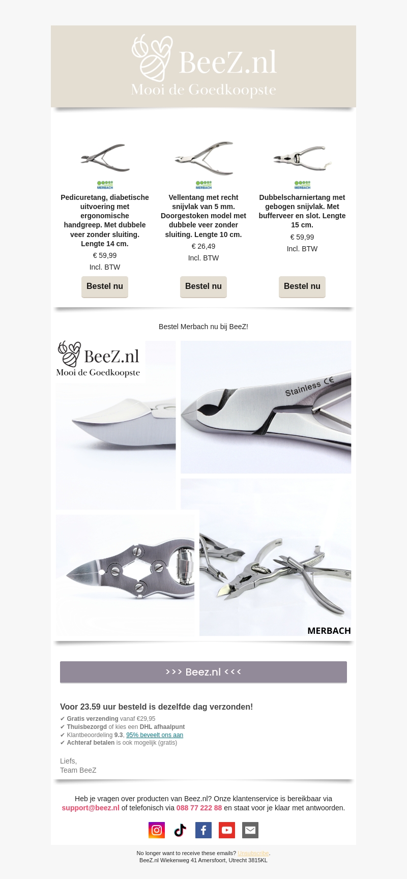 Bij BeeZ kunt u nu hoogwaardige Merbach tangen bestellen. Ontdek de pedicuretang, vellentang en dubbelscharnier tang die u helpen bij uw nagelverzorging. Snel besteld, snel in huis! Gratis verzending vanaf €29,95 en achteraf betalen mogelijk.