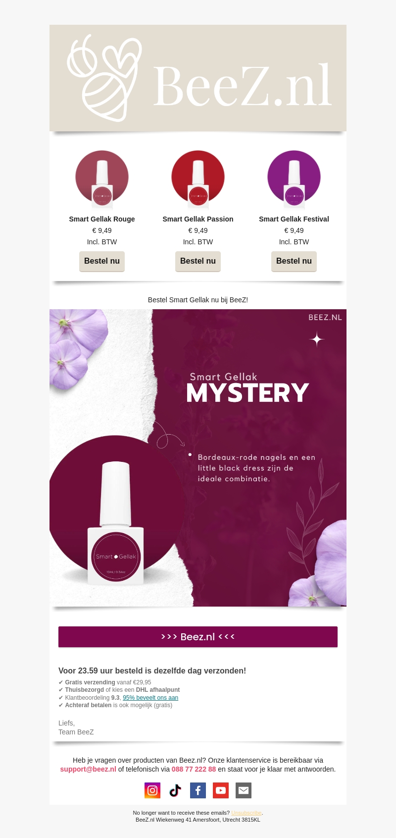Bestel nu de nieuwste Smart Gellak kleuren bij BeeZ. Kies uit Passion, Rouge en Festival voor slechts €9,49 per stuk. Mis ook de speciale Mystery kleur niet. Vandaag besteld, dezelfde dag verzonden. Gratis verzending vanaf €29,95.