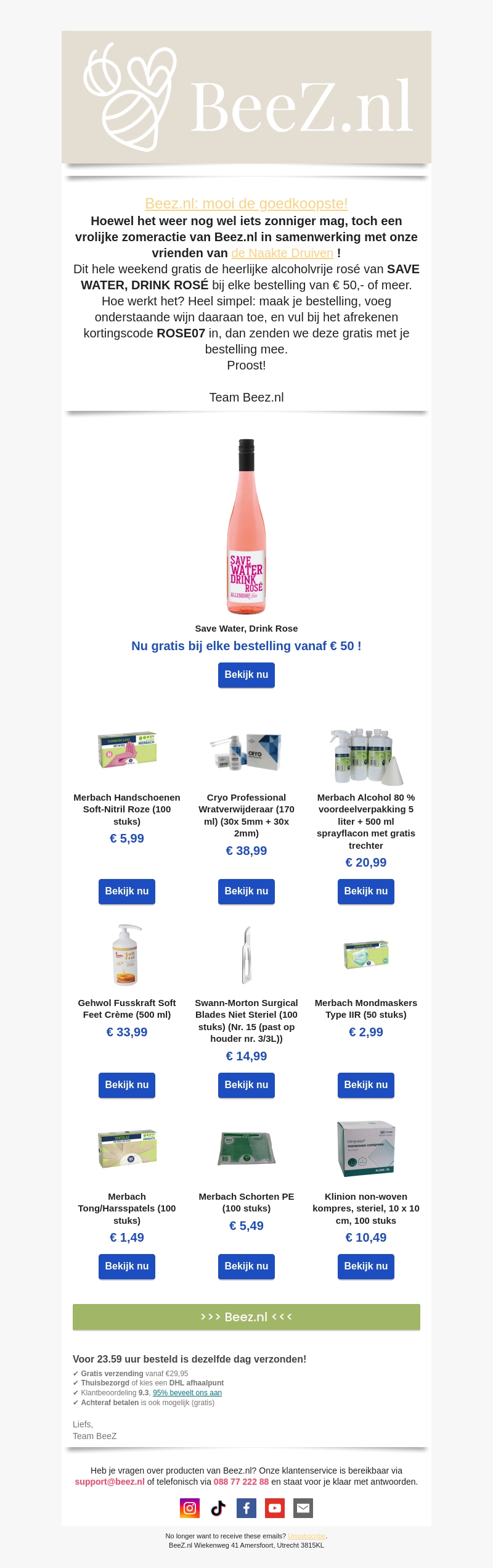 Beez.nl biedt een zomers cadeau! Bestel voor minimaal €50 en ontvang gratis een fles alcoholvrije rosé van Save Water, Drink Rosé. Voeg de wijn toe aan je bestelling en gebruik de kortingscode ROSE07 bij het afrekenen. Proost!
