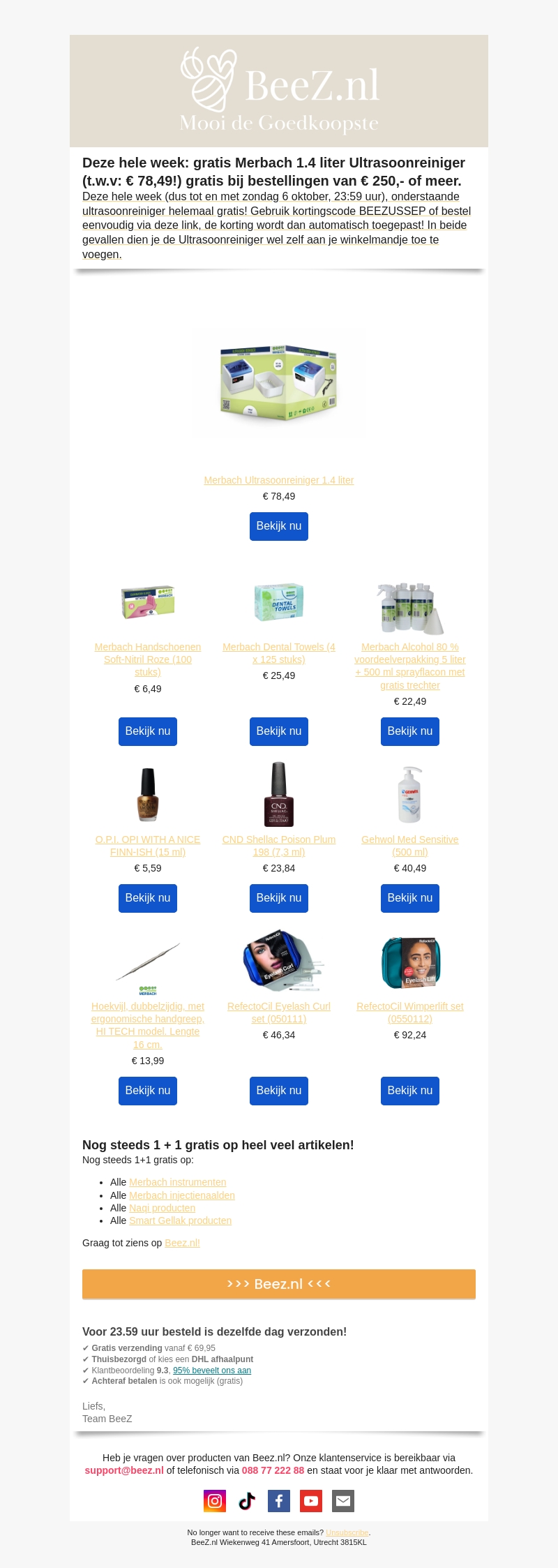 Deze week biedt BeeZ.nl een geweldige aanbieding: een gratis Merbach 1.4 liter ultrasoonreiniger (t.w.v. € 78,49) bij bestellingen van meer dan € 250,-. Bestel nu en gebruik de kortingscode BEEZUSSEP of bekijk andere kortingsacties en producten op de website van BeeZ.nl.