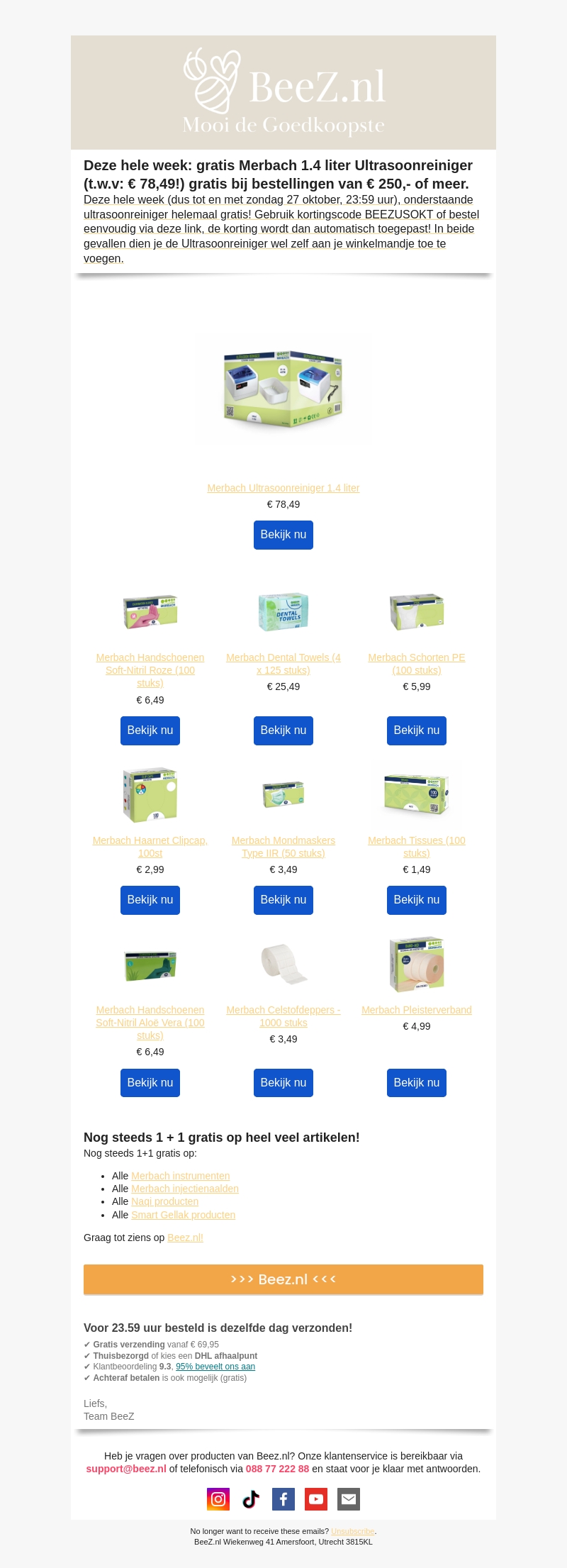 Ontdek deze week bij BeeZ.nl een exclusieve aanbieding. Ontvang een gratis Merbach ultrasoonreiniger ter waarde van € 78,49 bij bestellingen van meer dan € 250,-. Gebruik de code BEEZUSOKT en profiteer van deze actie. Wees er snel bij, de aanbieding is geldig tot en met 27 oktober.