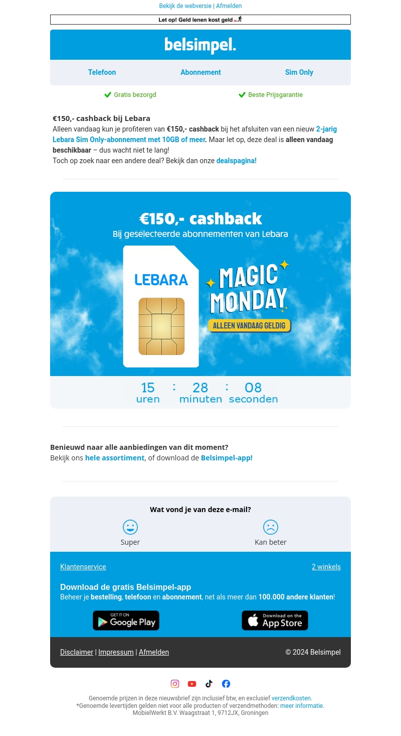 Mis deze eenmalige kans niet! Alleen vandaag krijg je €150,- cashback bij het afsluiten van een 2-jarig Lebara Sim Only-abonnement met minimaal 10GB. Dit is een beperkte aanbieding, dus zorg dat je er snel bij bent. Belsimpel biedt gratis bezorging en de beste prijsgarantie. Bekijk ook andere geweldige deals op de deals pagina!