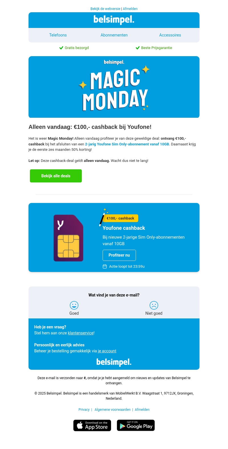 Het is Magic Monday bij Belsimpel! Alleen vandaag ontvang je €100,- cashback bij het afsluiten van een 2-jarig Youfone Sim Only-abonnement van 10GB. Bovendien krijg je de eerste zes maanden 50% korting. Let op: deze actie geldt alleen vandaag. Profiteer nu van deze geweldige deal en bespaar op je abonnement!