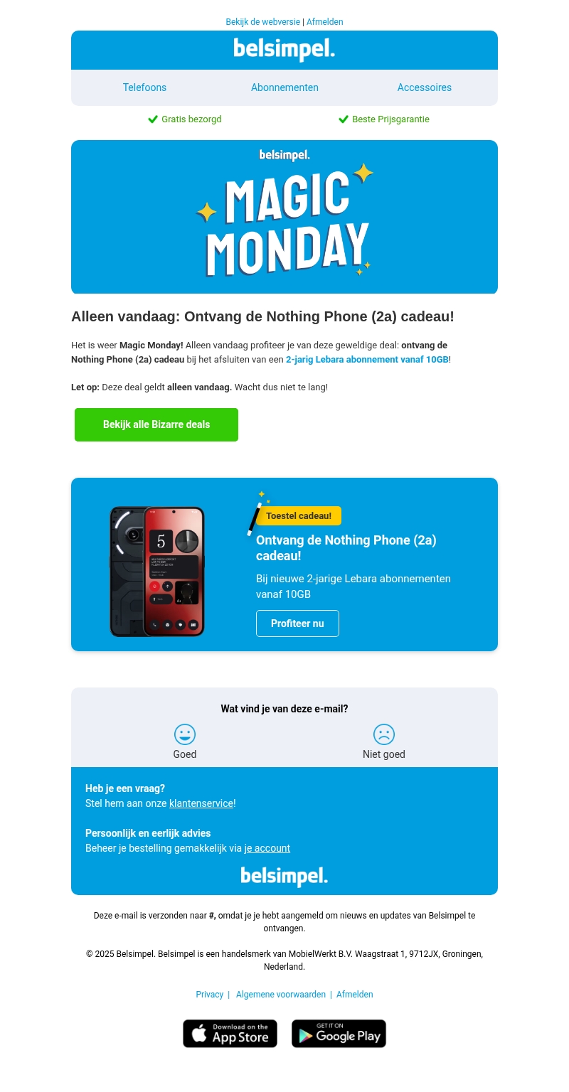 Beleef Magic Monday met een exclusieve aanbieding! Ontvang de Nothing Phone (2a) cadeau bij het afsluiten van een nieuw 2-jarig Lebara-abonnement met minimaal 10GB. Let op: deze actie is alleen vandaag geldig, dus mis het niet! Bekijk onze Bizarre deals voor meer verrassingen.