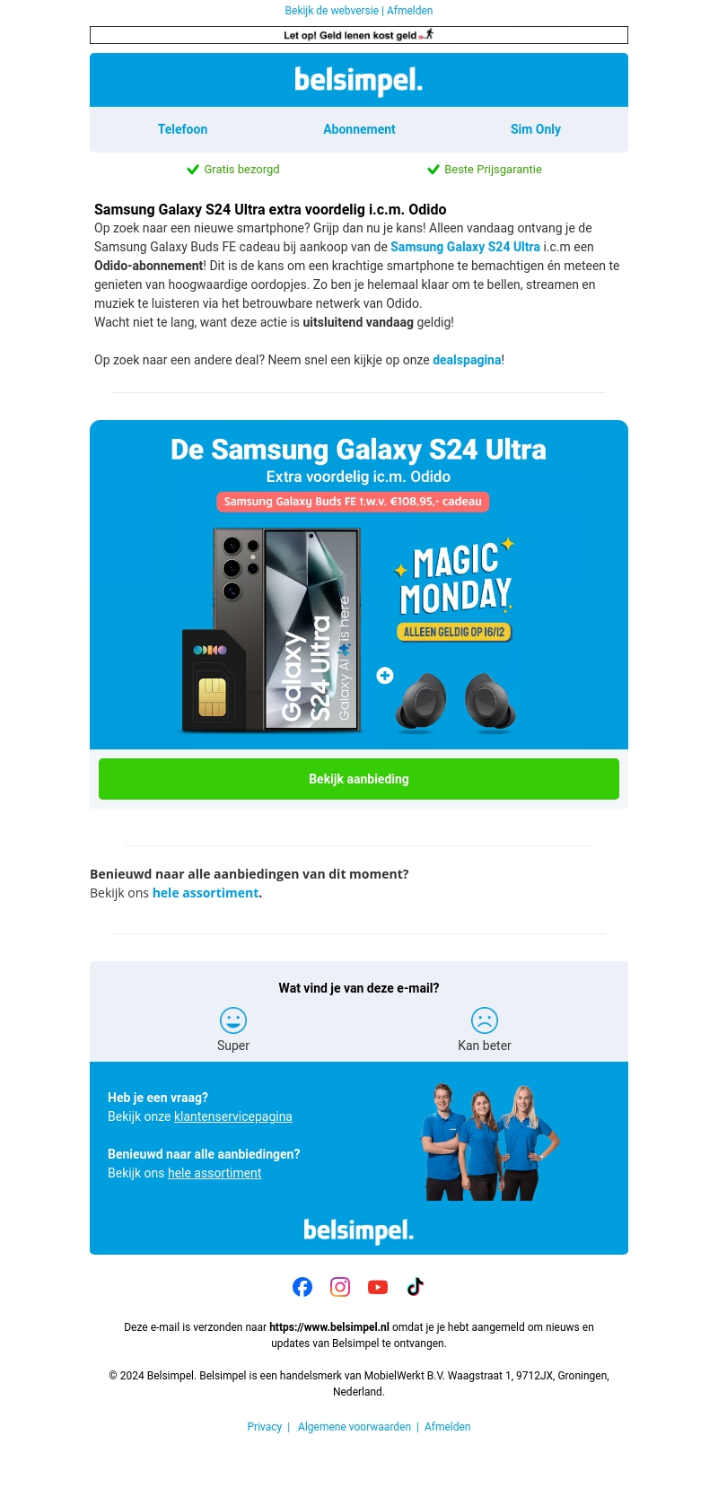 Ontvang de Samsung Galaxy S24 Ultra extra voordelig met Oddio. Alleen vandaag krijg je Samsung Galaxy Buds FE cadeau bij je aankoop van deze krachtige smartphone. Mis deze exclusieve aanbieding niet en geniet van kwalitatieve muziek en bellen met Oddio. De actie is uitsluitend vandaag geldig!