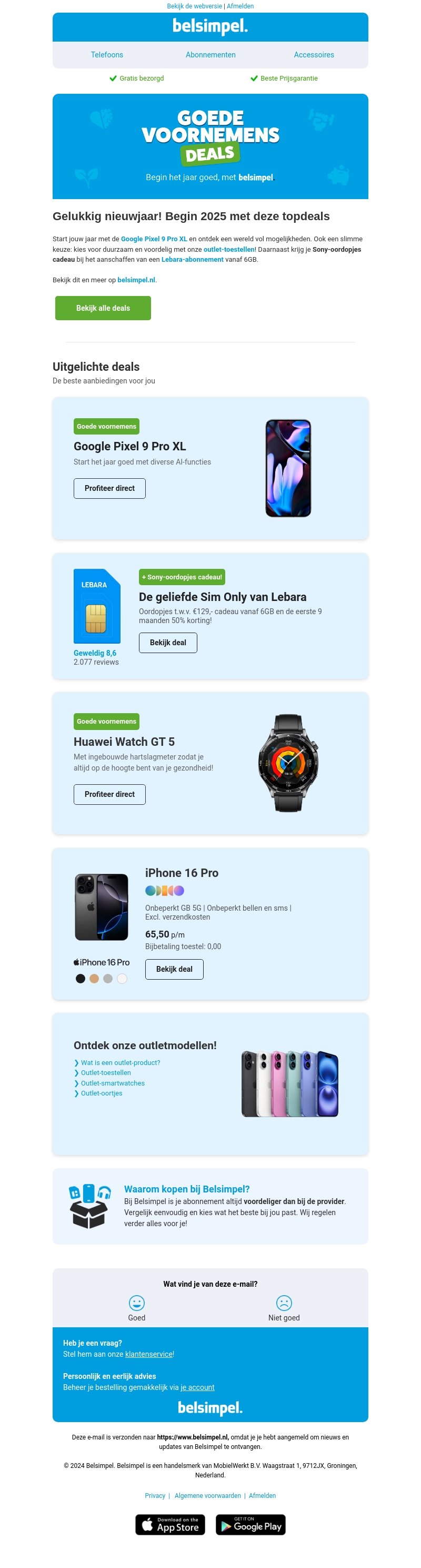 Belsimpel wenst je een gelukkig 2025 en start het jaar met geweldige aanbiedingen. Profiteer van deals op de Google Pixel 9 Pro XL met AI-functies, Huawei Watch GT 5, en de iPhone 16 Pro. Krijg Sony-oordopjes cadeau bij een Lebara-abonnement vanaf 6GB. Bekijk alle uitgelichte deals en ontdek hoogwaardige outlet-modellen. Voor meer informatie, ga naar belsimpel.nl.