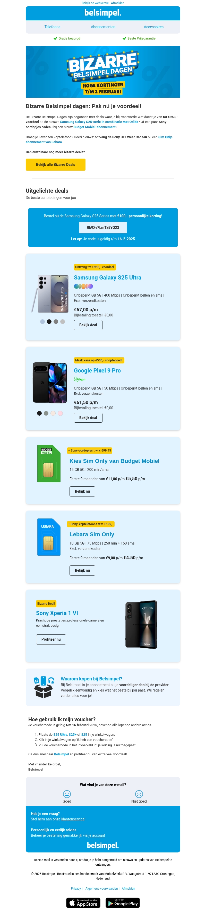 De Bizarre Belsimpel Dagen zijn begonnen met geweldige aanbiedingen op telefoons en abonnementen. Profiteer van hoge kortingen op de nieuwste modellen zoals de Samsung Galaxy S25 en Google Pixel 9 Pro. Ontvang extra voordelen zoals gratis toestellen en aantrekkelijke prijzen op SIM-only abonnementen. Deze aanbiedingen zijn geldig tot 16 februari 2025. Mis het niet!