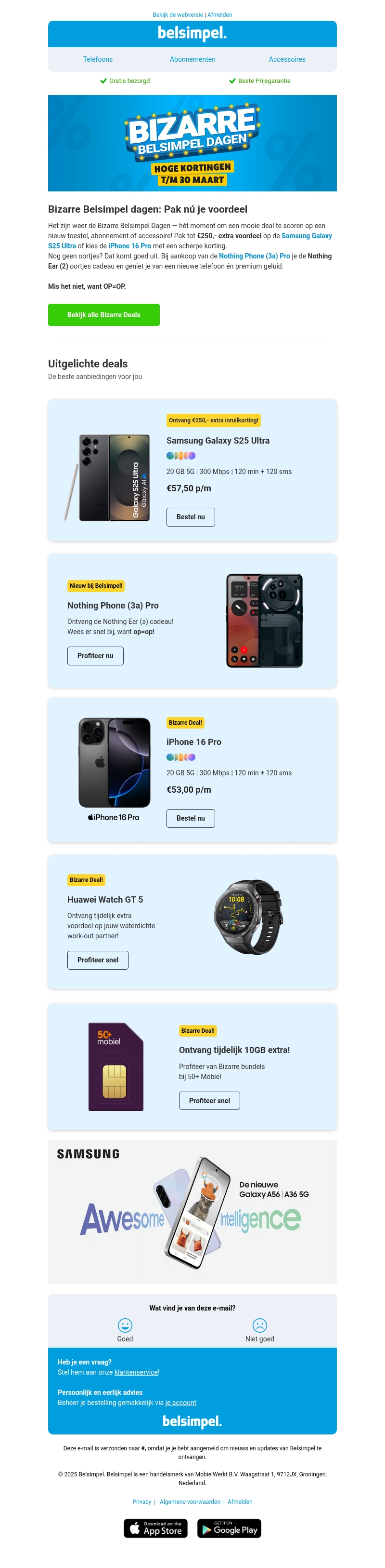 De Bizarre Belsimpel Dagen zijn begonnen! Scoor de beste deals op smartphones zoals de Samsung Galaxy S25 Ultra en iPhone 16 Pro. Nu met extra kortingen tot €250 op nieuwe toestellen en accessoires. Mis deze unieke kans niet en bestel voor 30 maart! Beperkte voorraad, wees er snel bij.
