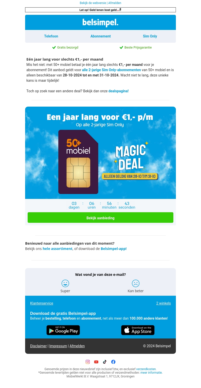 Profiteer nu van een geweldige aanbieding bij Belsimpel: voor slechts €1,- per maand kun je een heel jaar lang genieten van je 2-jarige Sim Only-abonnement. Dit aanbod is tijdelijk geldig van 28-10-2024 tot en met 31-10-2024. Mis deze kans niet om voordelig een abonnement af te sluiten. Bezoek onze website voor meer details of bekijk andere aanbiedingen.