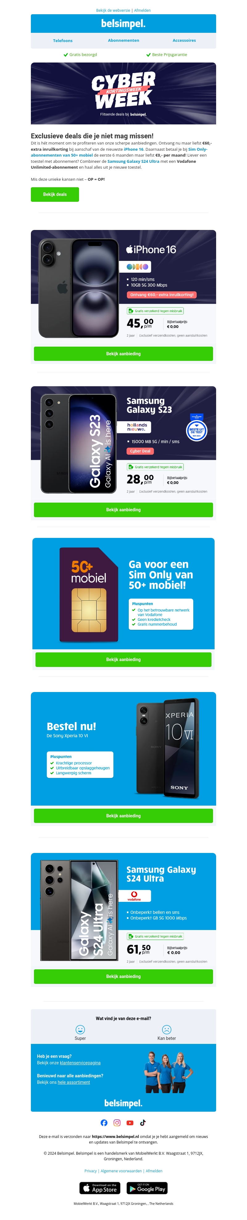 Mis de exclusieve aanbiedingen niet tijdens de Cyber Week bij Belsimpel. Profiteer nu van aanzienlijke kortingen op de nieuwste smartphones zoals de iPhone 16 en Samsung Galaxy S23. Ontvang tot maar liefst €600 extra inruilkorting op je oude toestel. Ben jij klaar voor een ongeëvenaarde deal?