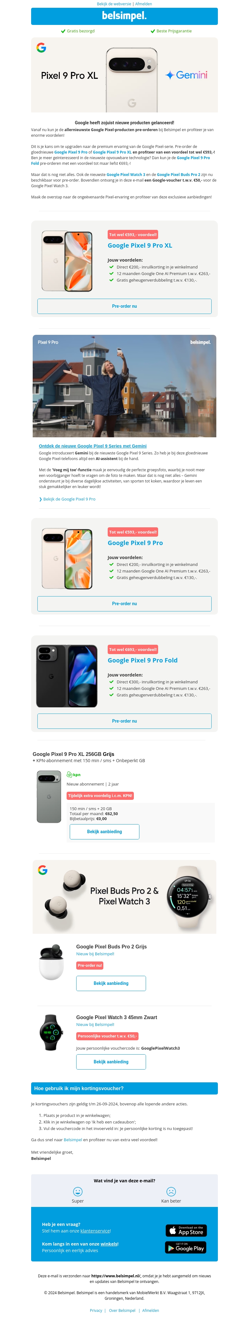Ontdek de nieuwste Google Pixel telefoons bij Belsimpel! De Google Pixel 9 Pro XL en Pixel 9 Pro Fold zijn nu beschikbaar om te pre-orderen. Profiteer van kortingen tot wel €931 en ontvang extra voordelen zoals gratis opslaguitbreiding en Google One Abonnementen. Bestel vandaag nog!