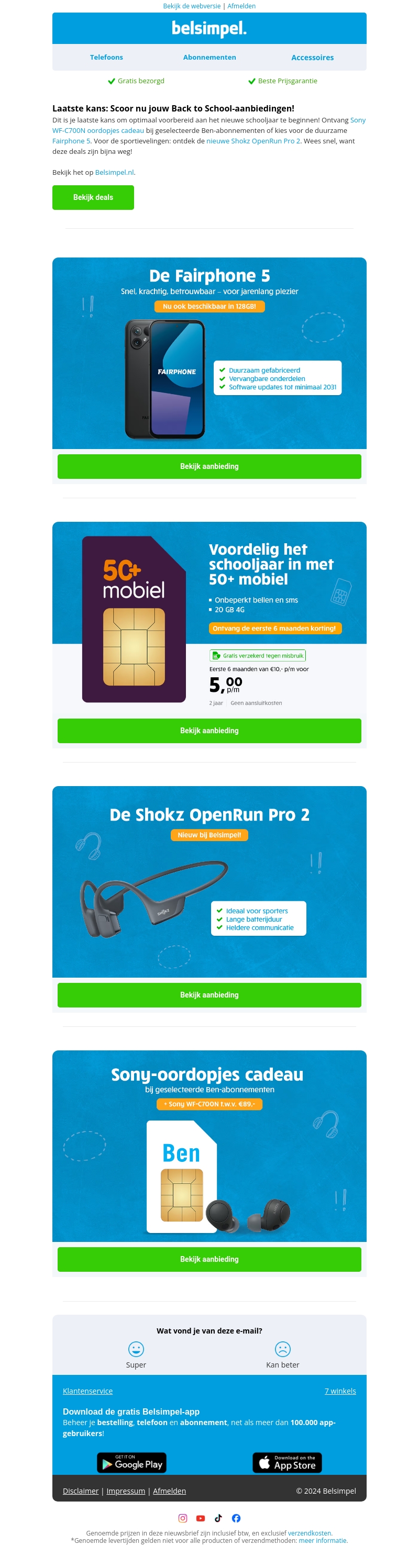 Dit is je laatste kans om optimaal voorbereid aan het nieuwe schooljaar te beginnen! Ontvang Sony WF-C700N oordopjes cadeau bij geselecteerde Ben-abonnementen of kies voor de duurzame Fairphone 5. Voor de sportievelingen: ontdek de nieuwe Shokz OpenRun Pro 2. Wees snel, want deze deals zijn bijna weg!