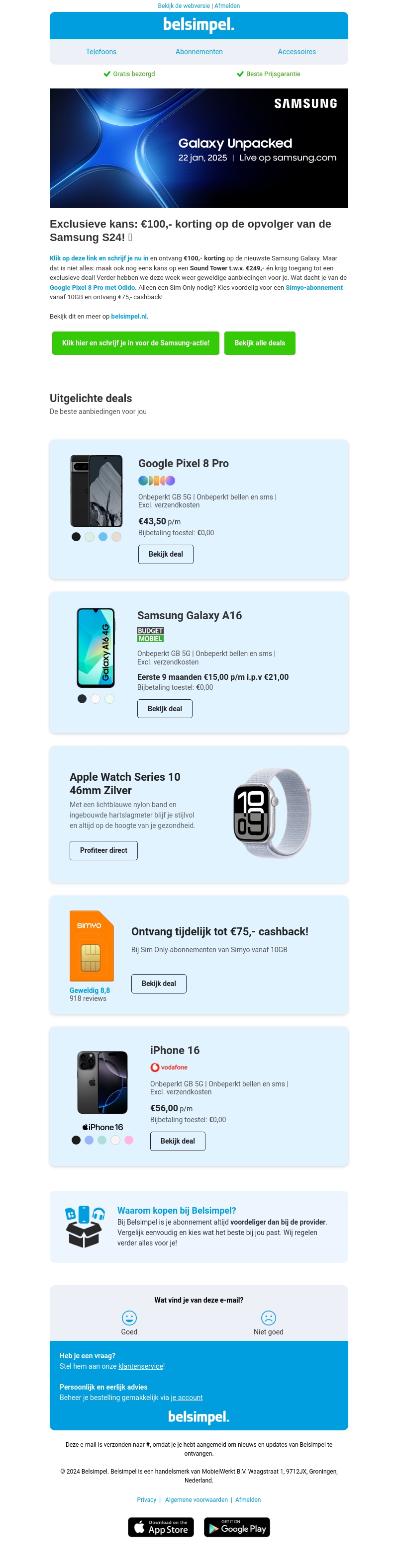 Profiteer van exclusieve kortingen op de Samsung S24 en andere toptoestellen zoals de Google Pixel 8 Pro en iPhone 16. Alleen bij belsimpel ontvang je tot €100,- korting en een Simyo cashback van €75,-. Bezorging is altijd gratis en je abonnement is voordeliger dan bij de provider.