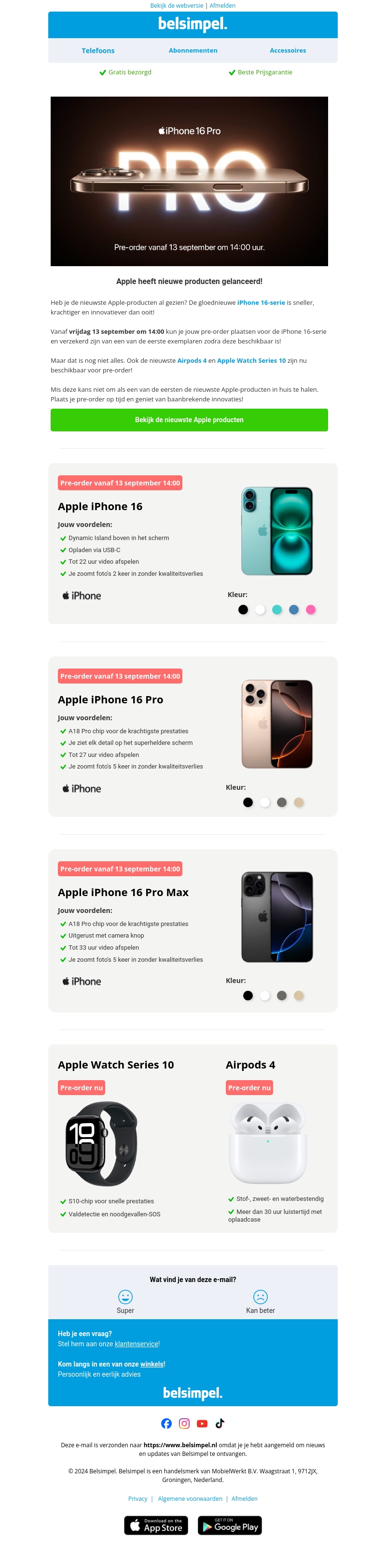Apple heeft nieuwe producten gelanceerd. De glorieusr nieuwe iPhone 16-serie is sneller, krachtiger en innovatiever dan ooit. Vanaf 13 september 14:00 kun je jouw pre-order plaatsen. Mis ook de nieuwe Airpods 4 en de Apple Watch Series 10 niet. Bekijk nu de nieuwste Apple producten bij Belsimpel.