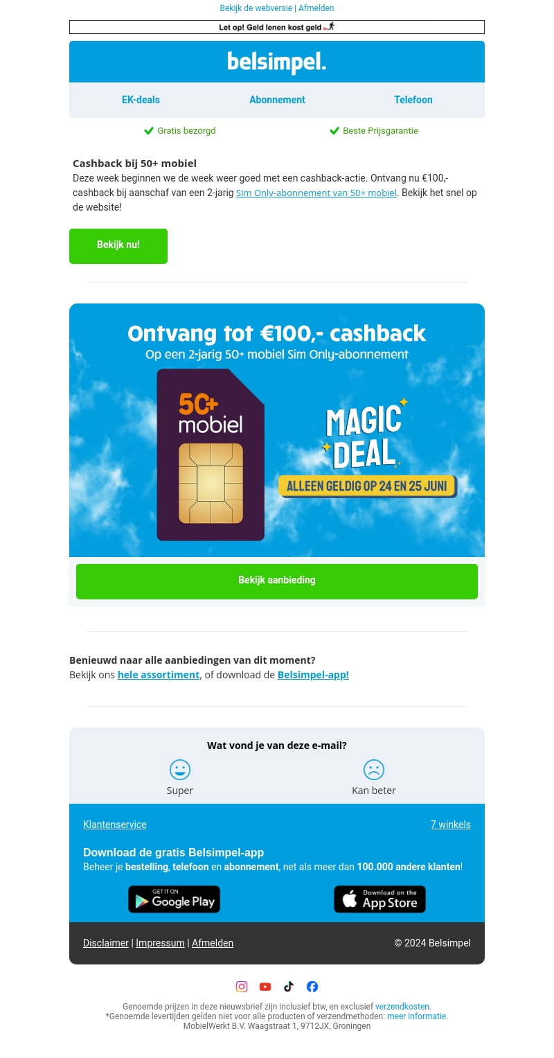 Deze week starten we met een geweldige cashback-actie bij Belsimpel. Ontvang nu €100,- cashback bij aankoop van een 2-jarig 50+ mobiel Sim Only-abonnement. Benieuwd naar alle aanbiedingen? Bekijk ons hele assortiment of download de Belsimpel-app!
