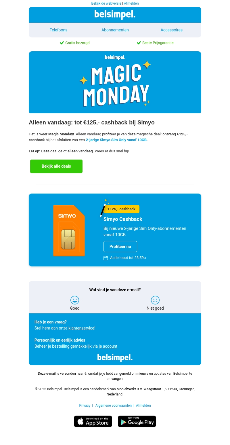 Geniet van de exclusieve Magic Monday aanbieding bij Belsimpel met €125,- cashback. Sluit vandaag een 2-jarig Simyo Sim Only-abonnement af en profiteer van deze geweldige deal. Mis het niet, deze aanbieding geldt alleen vandaag. Bezoek Belsimpel en bekijk alle deals die voor jou beschikbaar zijn.