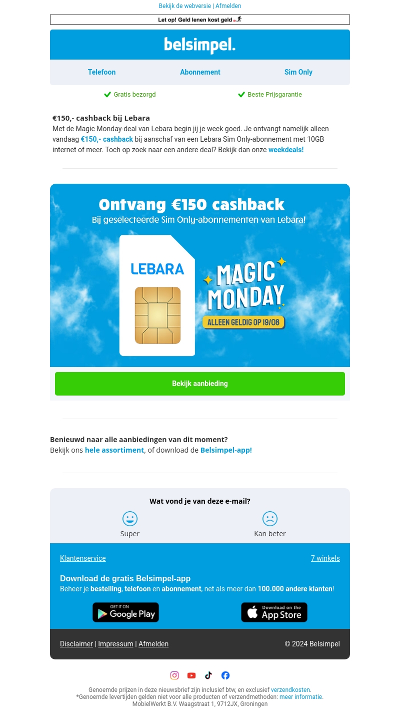 Start je week goed met de Magic Monday-deal van Lebara. Alleen vandaag ontvang je €150,- cashback bij aankoop van een Lebara Sim Only-abonnement met minimaal 10GB internet. Mis deze kans niet en bekijk de aanbieding!