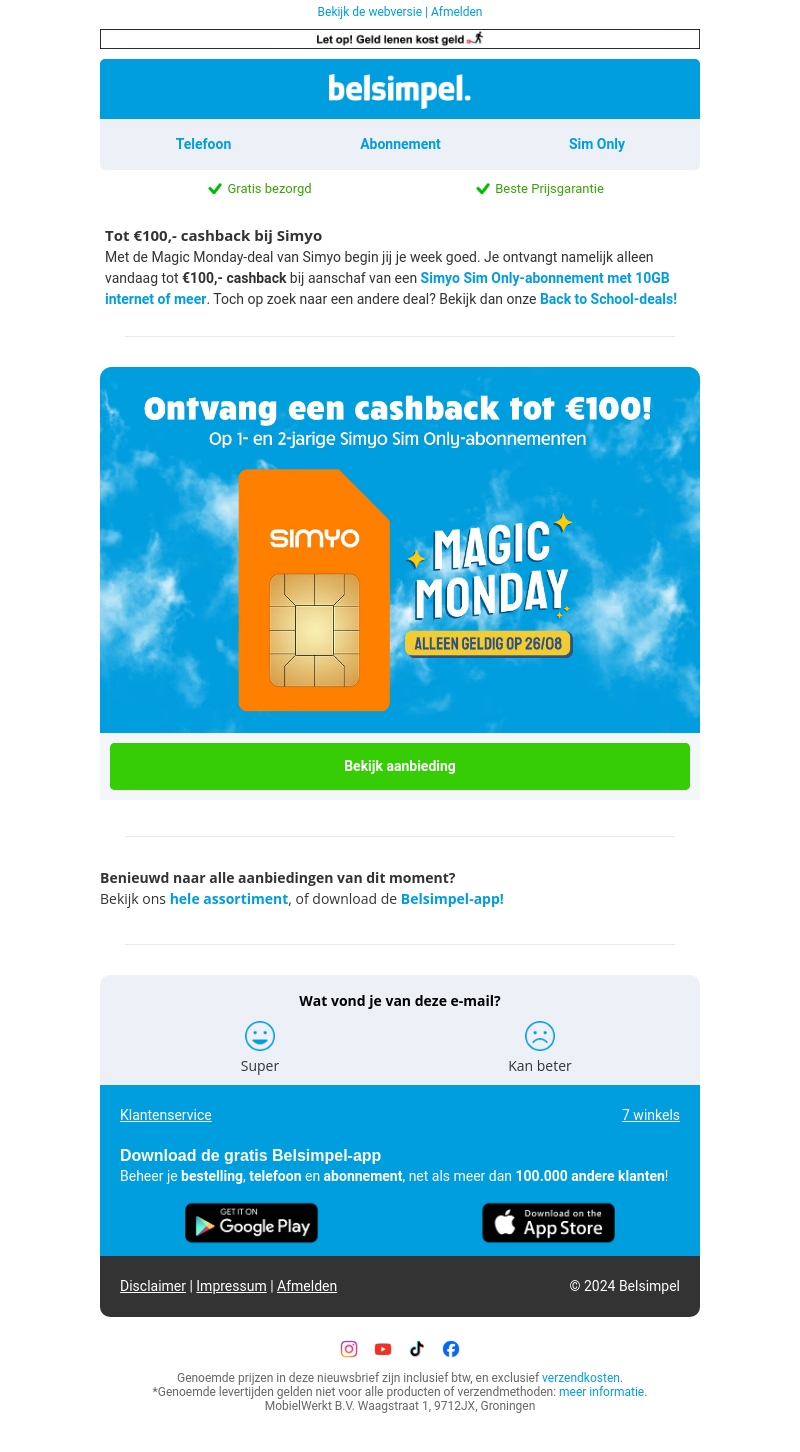 Tot €100,- cashback bij Simyo! Met de Magic Monday-deal van Simyo begin jij je week goed. Ontvang alleen vandaag tot €100,- terug bij aankoop van een Simyo Sim Only-abonnement. Mis deze kans niet en bekijk onze exclusieve Back to School-deals!