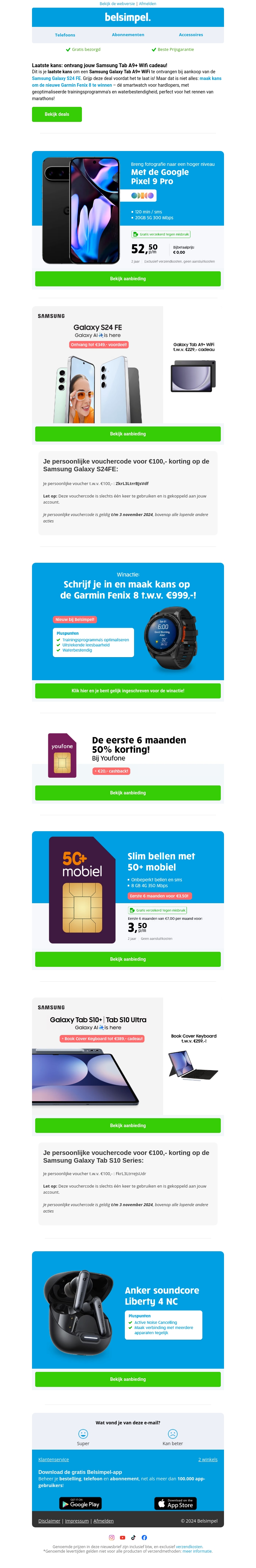 Mis deze kans niet en ontvang een gratis Samsung Galaxy Tab A9+ bij Belsimpel. Koop een Samsung Galaxy S24 FE en geniet van de extra's. Ontvang ook een persoonlijke voucher voor €100 korting en maak kans op een Garmin Fenix 8. Bekijk alle aanbiedingen en voorwaarden op de website.