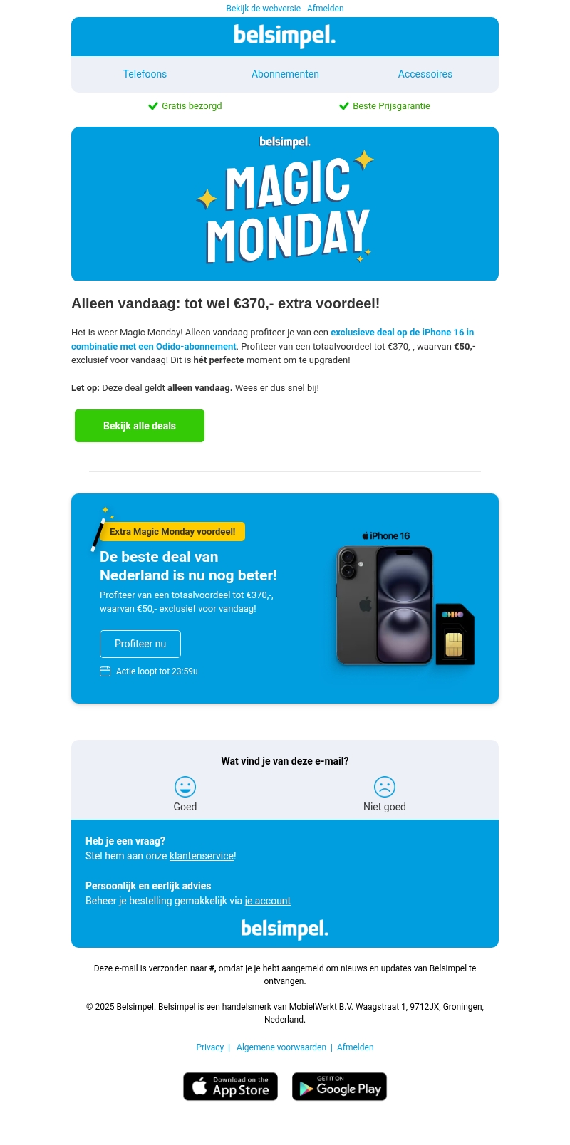 Het is Magic Monday bij Belsimpel! Profiteer vandaag van een exclusieve deal op de iPhone 16 met Odido-abonnement en ontvang tot €370,- voordeel. Wees er snel bij voor dit tijdelijke aanbod. De actie geldt alleen vandaag en biedt een unieke kans om te upgraden.