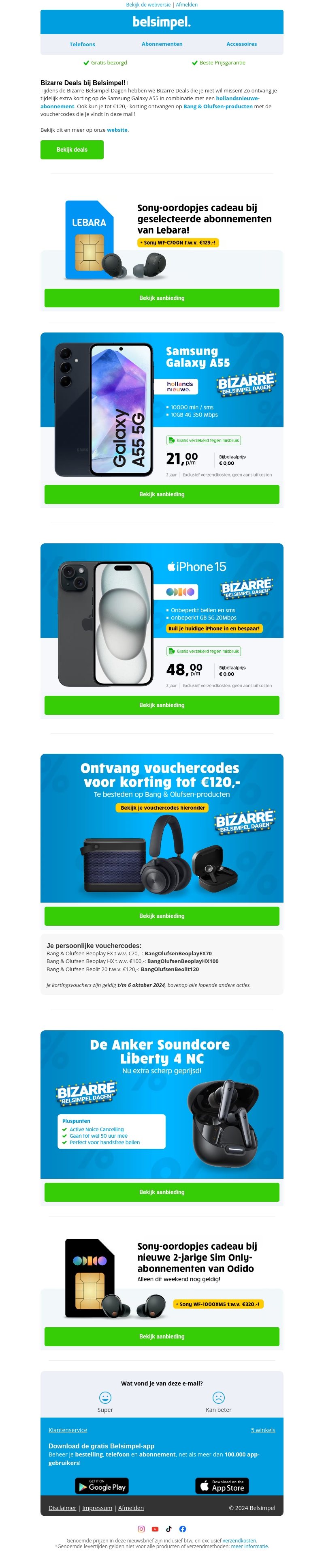 Maak gebruik van de Bizarre Deals bij Belsimpel! Ontvang geweldige kortingen op geselecteerde telefoons zoals de Samsung Galaxy A55 en iPhone 15. Ook krijg je cadeautjes bij bepaalde abonnementsaanbiedingen van Lebara en Odido. Vergeet niet je persoonlijke vouchercodes te gebruiken voor extra korting op Bang & Olufsen-producten.