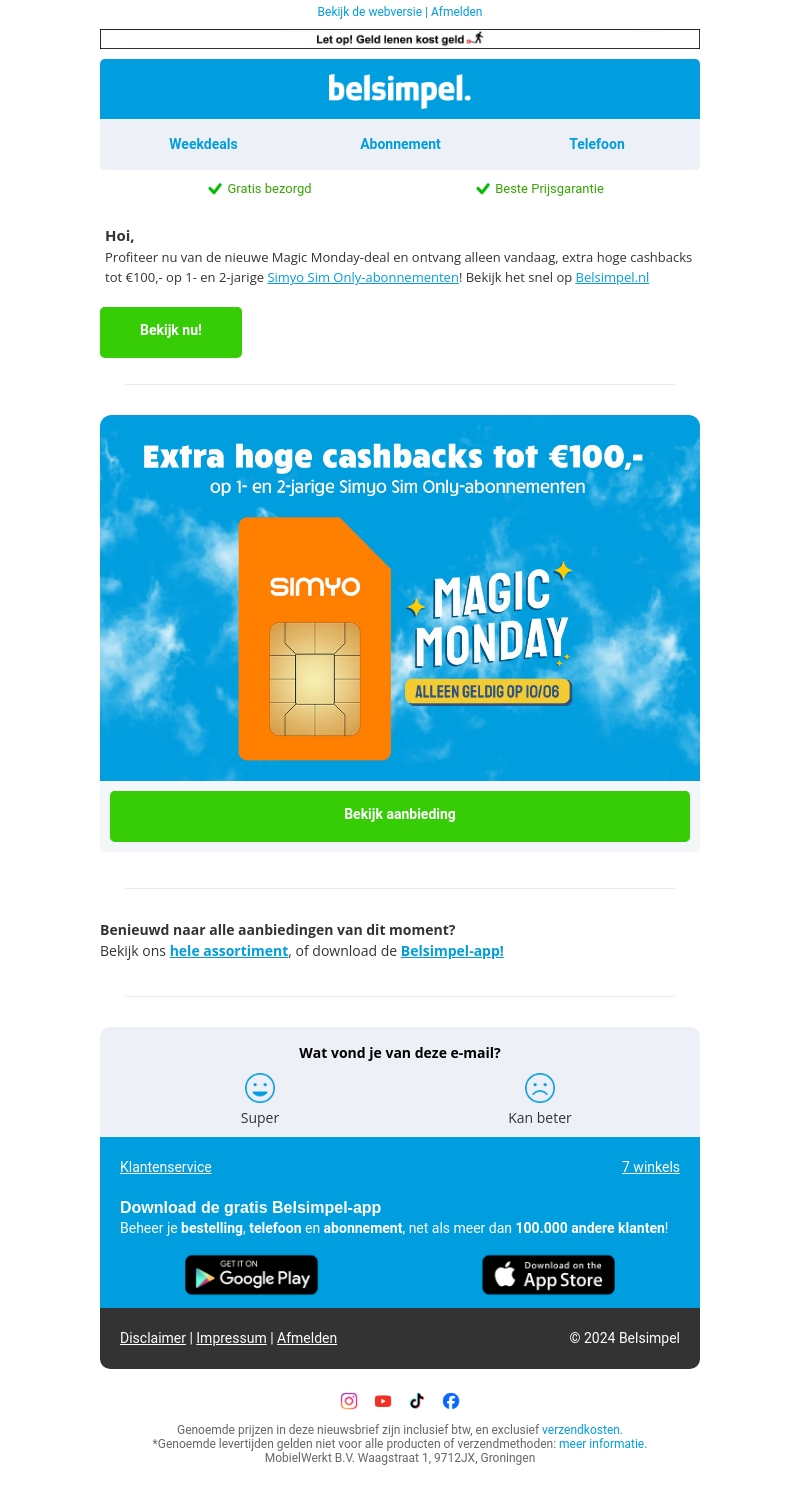 Profiteer nu van de nieuwe Magic Monday-deal en ontvang extra hoge cashbacks tot €100 bij 1- en 2-jarige Simyo Sim Only-abonnementen! Deze aanbieding is alleen vandaag geldig, dus wees er snel bij. Bezoek Belsimpel.nl voor meer details en ontdek deze en andere geweldige aanbiedingen.