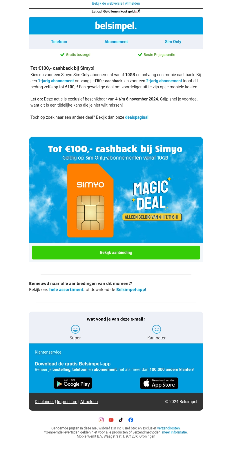 Ontvang een geweldige cashback bij het afsluiten van een Simyo Sim Only-abonnement. Kies voor 1 of 2-jarige contracten en bespaar tot €100,-! Deze aanbieding is geldig van 4 tot en met 6 november 2024. Grijp je kans nu! Bezoek onze dealpagina voor meer informatie.