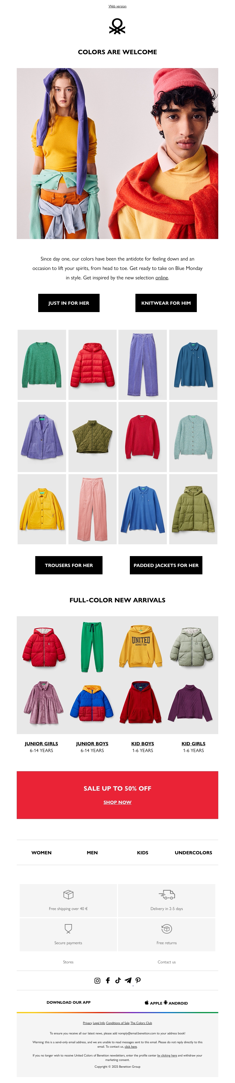 Welkom bij onze kleurrijke modecollectie die een vleugje vrolijkheid aan Blue Monday geeft. Verken de nieuwste aankomsten voor dames, heren en kinderen, variërend van truien tot gewatteerde jassen. Geniet van kortingen tot 50% en mis de kans niet om je garderobe te verrijken met levendige kleuren. Deze collectie biedt zowel stijl als comfort voor het hele gezin. Bekijk onze selectie online en shop nu.