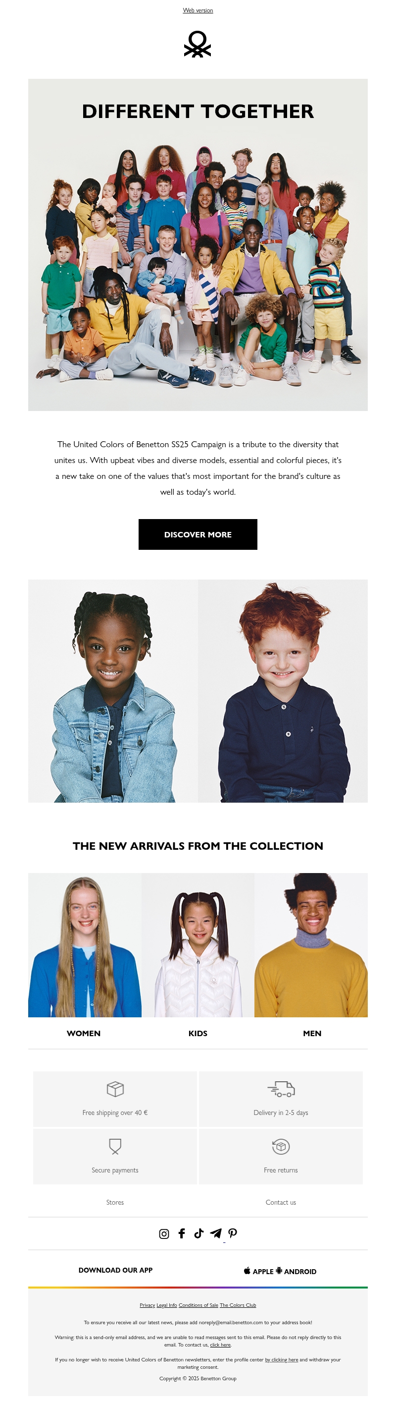 De United Colors of Benetton SS25-campagne viert diversiteit met levendige modellen en kleurrijke stijlen. Deze collectie benadrukt de belangrijke waarden van de hedendaagse cultuur. Met nieuwe dames-, heren- en kindermode wil Benetton verbinding creëren door mode. Ontdek de collectie online en geniet van gratis verzending bij bestellingen van meer dan €40.