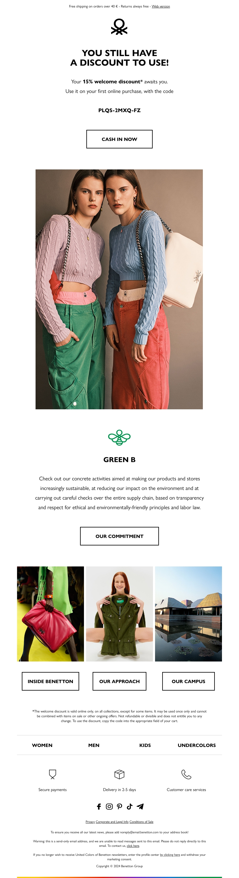Je hebt nog steeds een korting van 15% tegoed! Gebruik deze bij je eerste online aankoop met de code PLQS-2MXQ-FZ. Ontdek ook onze toewijding aan duurzaamheid en ethische handel. Mis deze kans niet en shop nu bij Benetton!