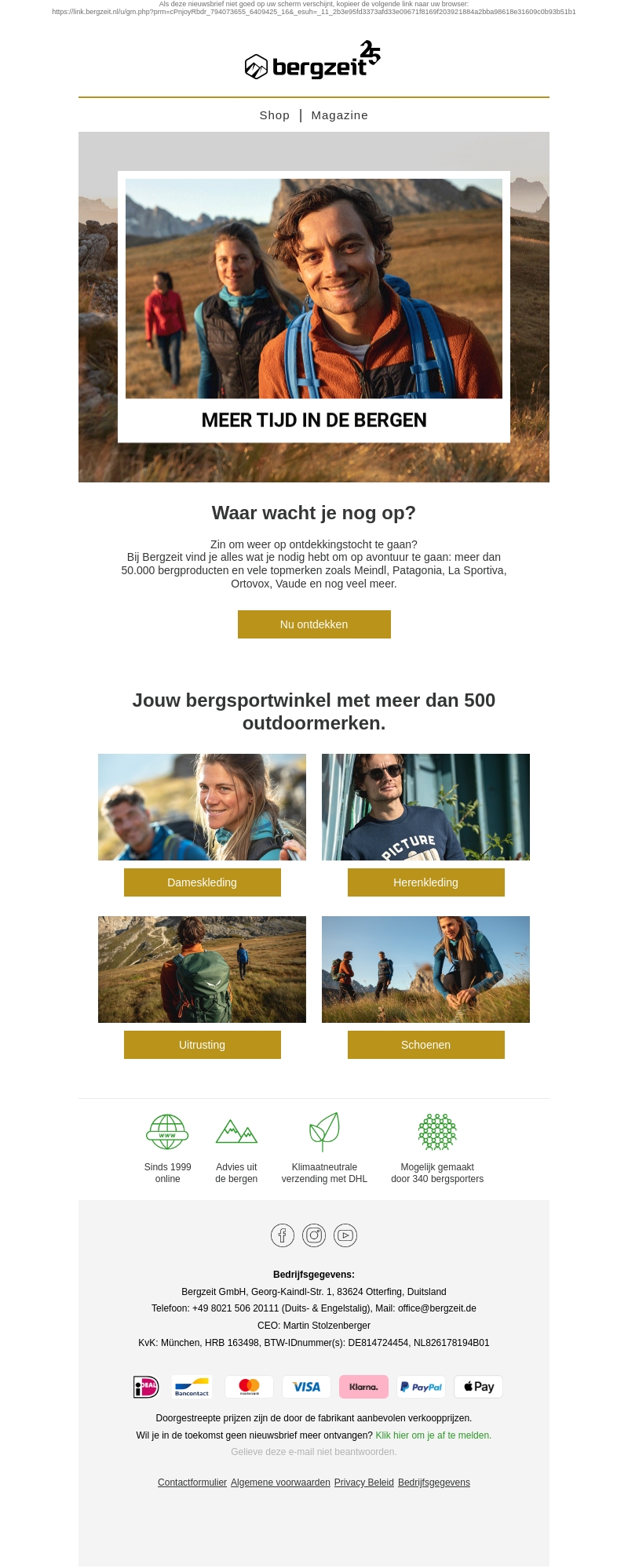 Bergzeit nodigt je uit voor avontuur met meer dan 50.000 outdoorproducten. Ontdek toonaangevende merken zoals Meindl, Patagonia, La Sportiva en nog veel meer. Of je nu op zoek bent naar dames- of herenkleding, uitrusting of schoenen, Bergzeit heeft alles wat je nodig hebt. Begin je ontdekkingsreis nu!