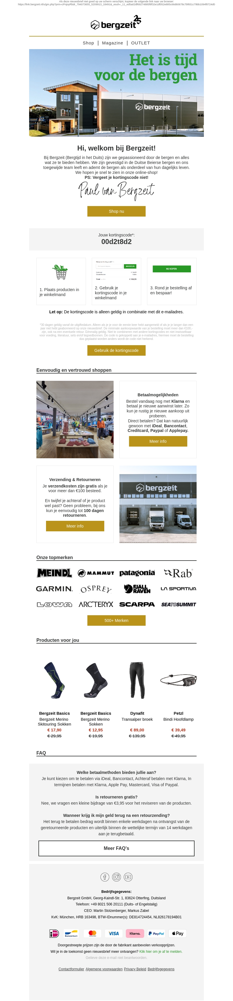 Het is tijd voor de bergen met Bergzeit! Verwelkom de natuur met onze exclusieve berguitrusting. Ontvang 10% korting met onze kortingscode. Shop eenvoudig en vertrouw op topmerken zoals Marmot en Arc'teryx. Onze verzending is snel en je kunt altijd eenvoudig retourneren. Start je avontuur nu!