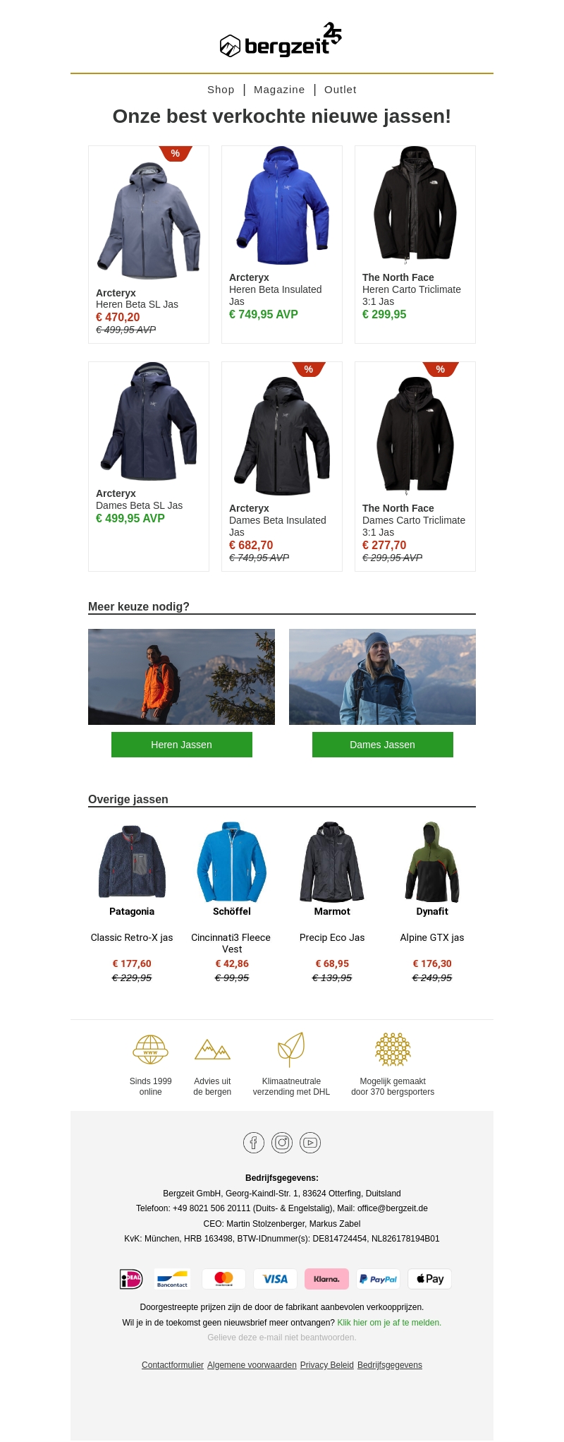 Onze nieuwste nieuwsbrief presenteert de best verkochte jassen van topmerken als Arcteryx en The North Face. Profiteer van aantrekkelijke kortingen op heren- en damesjassen. Of u nu op zoekt bent naar stijl of functionaliteit, wij hebben het allemaal. Ontdek onze collectie en sla uw slag met de beste prijzen. Bezoek onze website voor meer keuze en aanbiedingen.