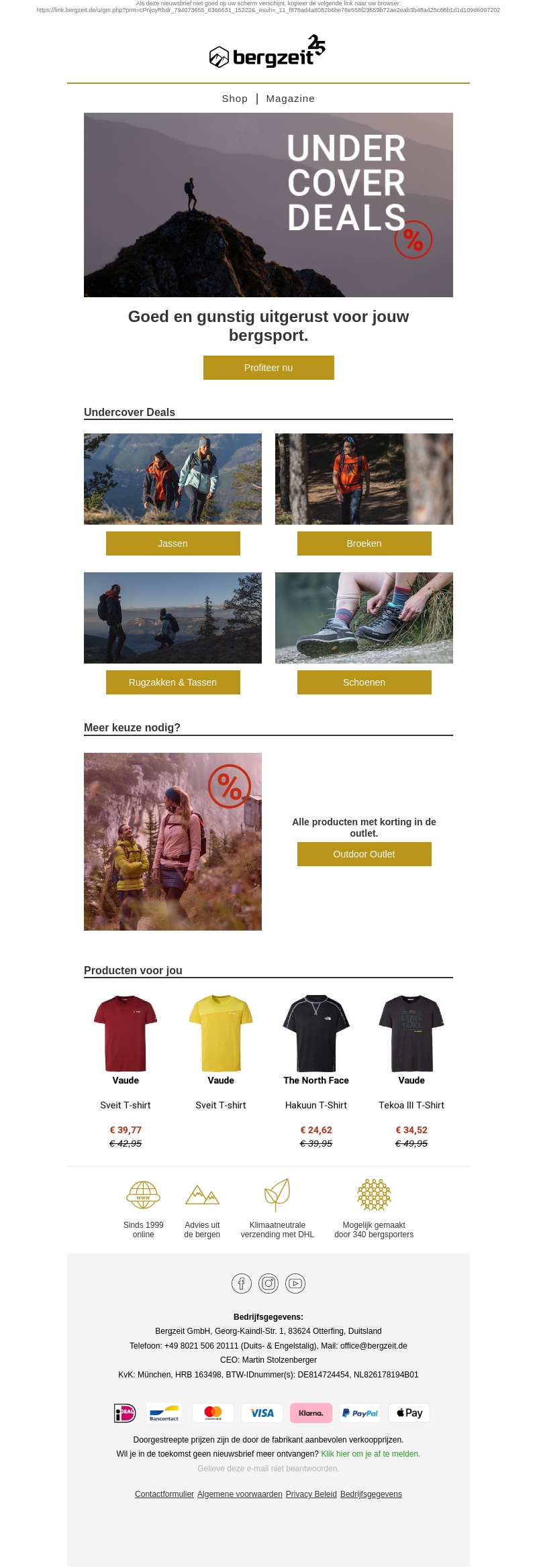 Profiteer van flinke kortingen op een breed scala aan outdoor producten bij Bergzeit. Van jassen tot schoenen, alles is beschikbaar met indrukwekkende deals. Mis deze kans niet om je bergsportuitrusting voordelig aan te schaffen. Bekijk ook onze outlet voor nog meer besparingen. Begin je avontuur vandaag nog met onze speciale aanbiedingen!