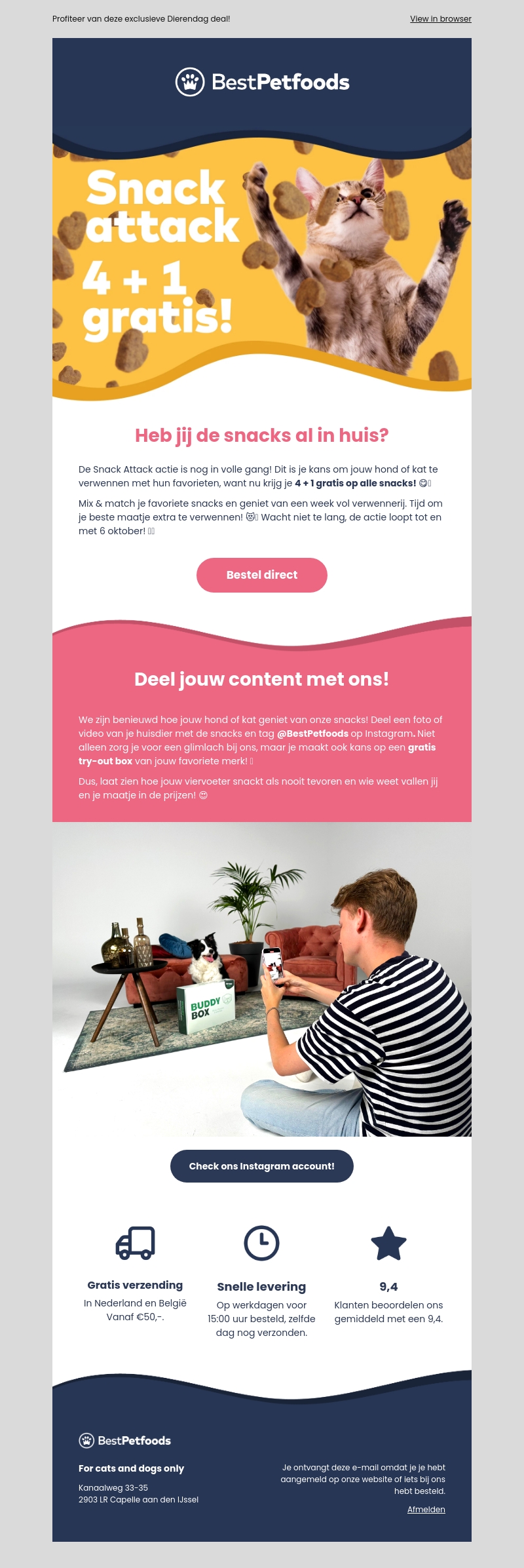 De Snack Attack actiemaand is in volle gang bij BestPetfoods! Verwen je huisdier met een speciale aanbieding: 4+1 gratis op alle favoriete snacks. Mix en match en geniet van de kwaliteit. Aarzel niet, deze deal loopt tot en met 6 oktober.