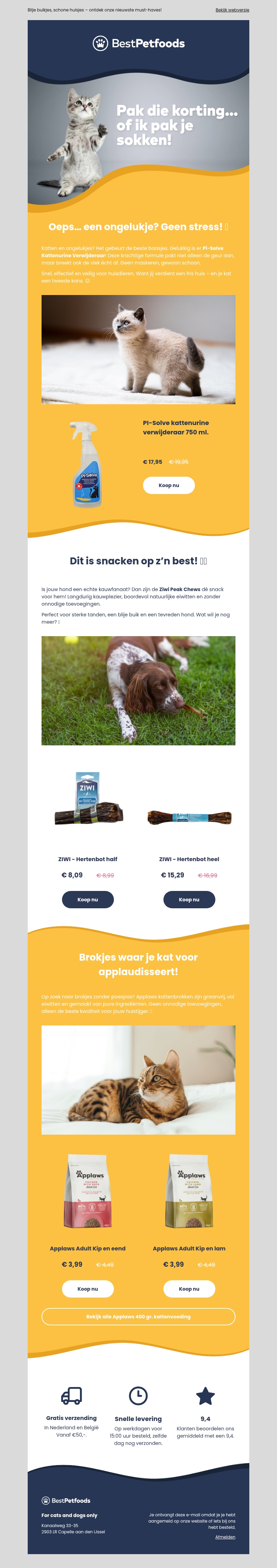 Profiteer van speciale aanbiedingen op de beste producten voor katten en honden bij BestPetfoods. Van effectieve middelen tegen ongelukjes tot smakelijke snacks voor je trouwste viervoeter. Mis deze kans niet om je huisdieren te verwennen en te besparen!