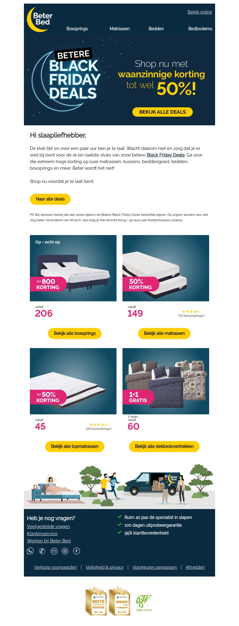 Mis de Betere Black Friday Deals van Beter Bed niet! Geniet van kortingen tot wel 50% op luxe matrassen, boxsprings, kussens en meer. Zorg dat je er snel bij bent, want de voorraad is beperkt. Dit is jouw kans om je slaapcomfort naar een hoger niveau te tillen. Winkelen voor de beste nachtrust was nog nooit zo voordelig. Grijp je voordeel vandaag nog.