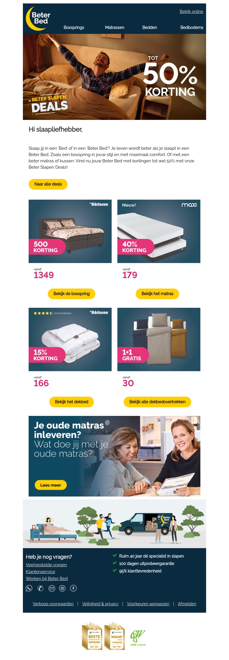 Verbeter je slaapervaring met de nieuwste Beter Bed aanbiedingen. Geniet van kortingen tot 50% op onder andere boxsprings, matrassen en dekbedden. Ontvang 1+1 gratis op geselecteerde dekbedovertrekken. Lever je oude matras in en ontvang een extra korting. Wacht niet langer en upgrade je slaap met Beter Bed!