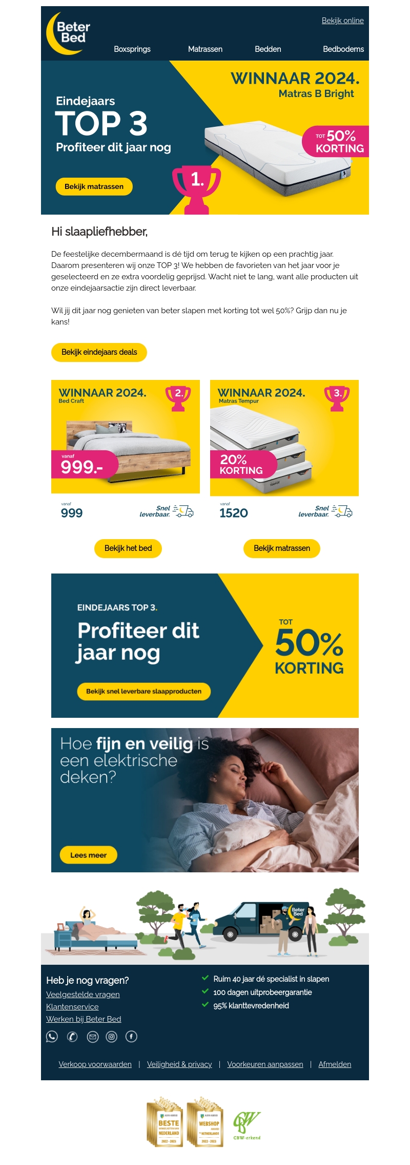De decembermaand is de tijd voor terugblikken en profiteren van geweldige aanbiedingen. Beter Bed presenteert de eindejaars top 3 matrassen met kortingen tot 50%. Geniet van snelle levering en grijp de kans om jouw slaapcomfort te verbeteren met deze winnaars van 2024. Mis deze fantastische aanbiedingen niet.