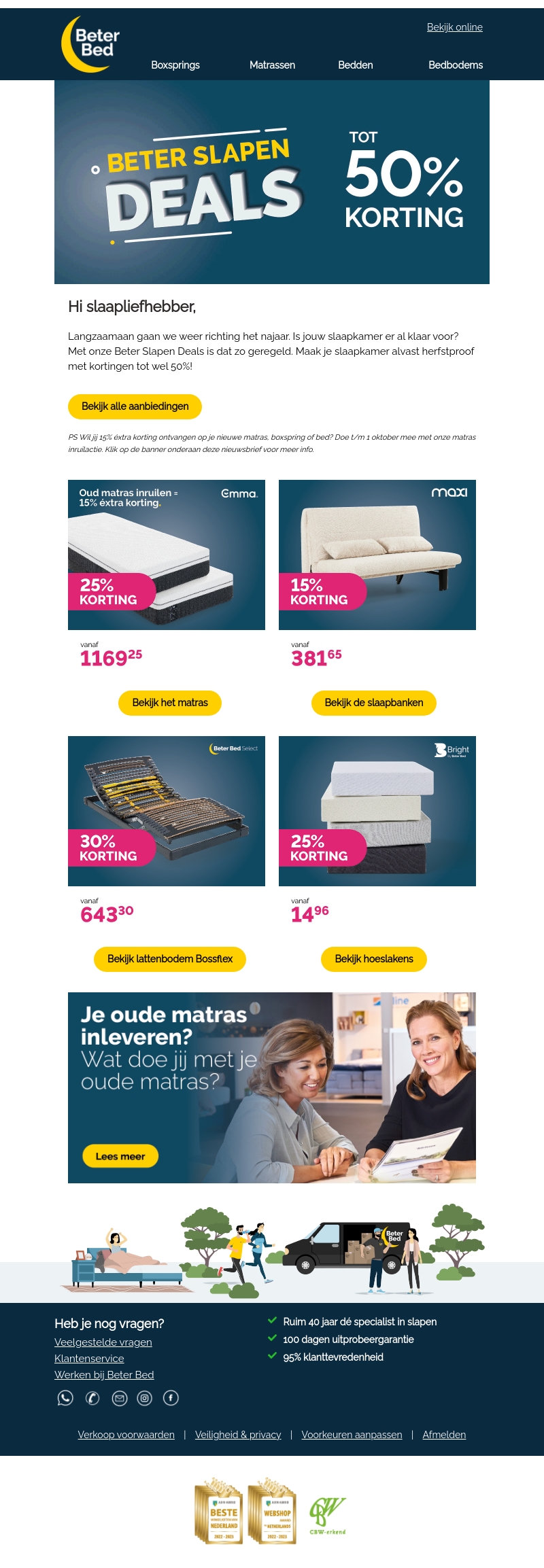Langzaam gaan we weer richting het najaar. Is jouw slaapkamer er al klaar voor? Met de Beter Slapen Deals van Beter Bed maak je je slaapkamer herfstproof met kortingen tot wel 50%! Ontdek de verschillende aanbiedingen op matrassen, bedden, lattenbodems en meer.