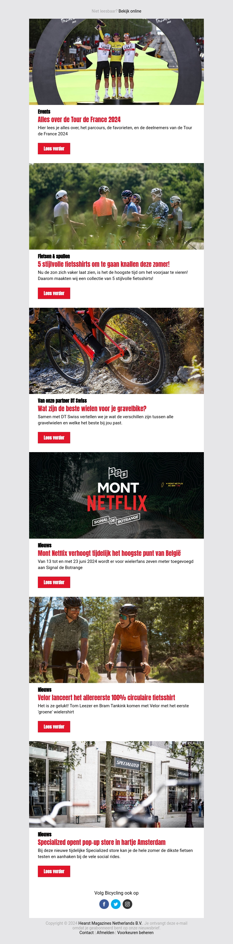 Blijf op de hoogte van de Tour de France 2024 met het laatste nieuws over het parcours, de favorieten, en de deelnemende teams. Bekijk de nieuwste fietsshirts voor de zomer, tips voor gravelbikes, en ander wielernieuws. Mont Netfli, een bijzondere fietsplek, wacht op jou. Ontdek ook Specialized's nieuwe pop-up store in Amsterdam.
