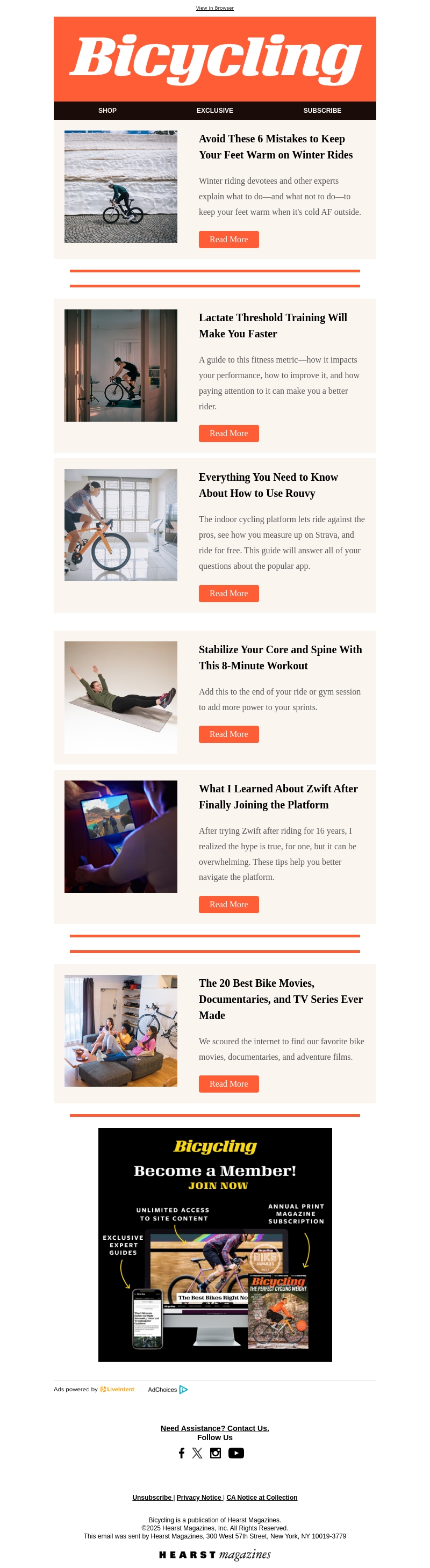 Deze nieuwsbrief van Bicycling Magazine belicht essentiële tips om je voeten warm te houden tijdens winterse fietstochten. Leer van experts welke zes fouten je moet vermijden en krijg inzicht in hoe je je ritten comfortabeler kunt maken. Het artikel bespreekt ook aanbevelingen voor geschikte uitrusting en technieken om de kou te trotseren. Deze informatie is cruciaal voor fietsers die ook in de koude maanden actief willen blijven. Laat de kou je niet verrassen. Bereid je voor op een succesvolle winterfietsseizoen.