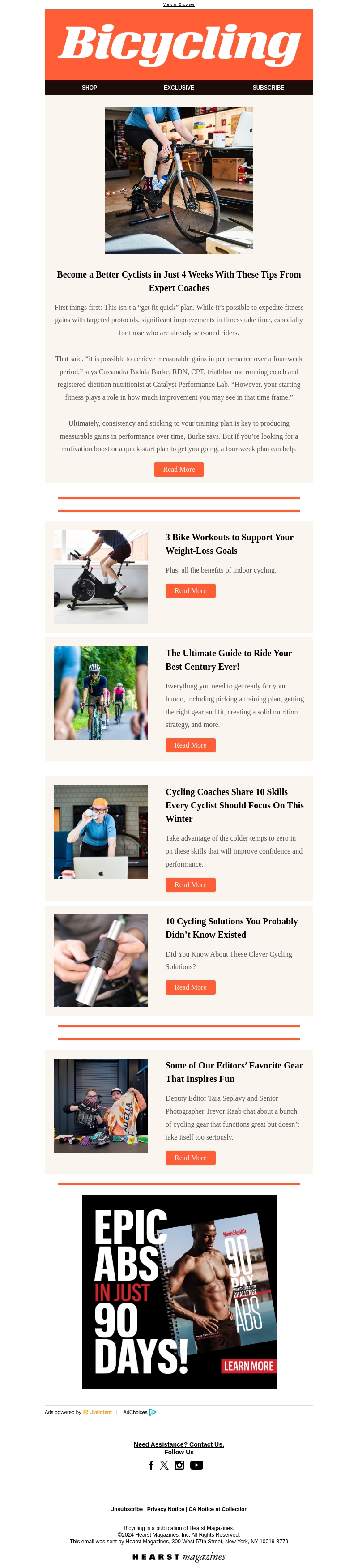 Ontdek hoe je in slechts vier weken een betere fietser kunt worden met adviezen van deskundige coaches. Deze nieuwsbrief biedt trainingstips, binnenfietsworkouts en essentiële vaardigheden voor in de winter. Vind ook aanbevelingen voor inspirerende fietsspullen en geheime fietsoplossingen die je waarschijnlijk nog niet kende.