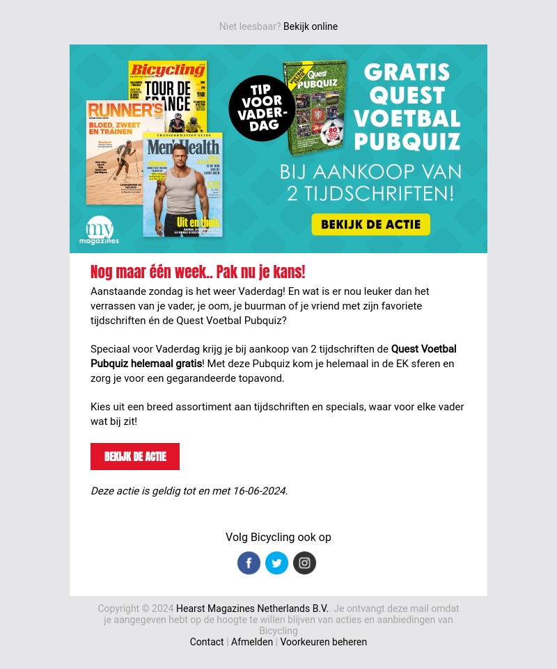 Deze Vaderdag hebben we een geweldige actie voor jou! Bij aankoop van 2 tijdschriften krijg je de Quest Voetbal Pubquiz helemaal gratis. Verwen je vader, oom of vriend met zijn favoriete tijdschriften en een leuke pubquiz. De actie is geldig tot en met 16-06-2024.