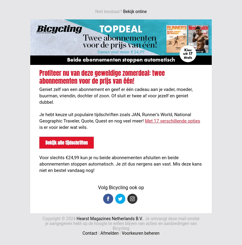 Profiteer nu van deze schitterende zomeractie! Ontvang twee abonnementen voor de prijs van één en kies uit populaire titels zoals JAN, Runner's World en meer. Voor slechts €24,99 kun je beide abonnementen afsluiten. Bestel vandaag nog en mis deze kans niet!