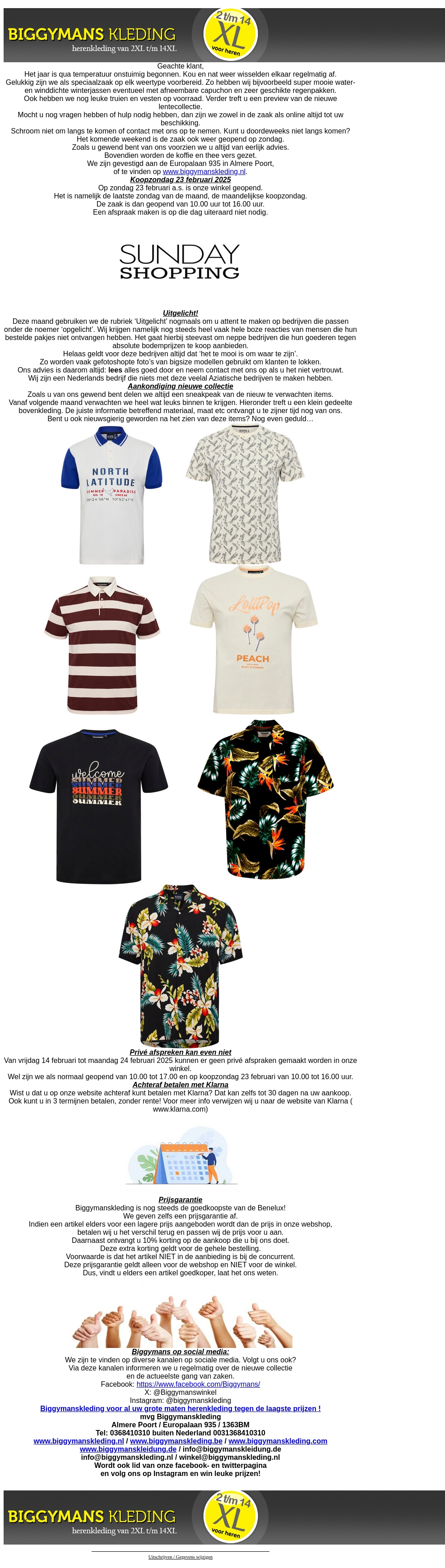 Verken de nieuwste lente- en zomercollectie 2025 bij Biggymans Kleding! Geniet van extra koopplezier op onze speciale koopzondag 23 februari. Helaas kunnen er tijdelijk geen privé-afspraken gemaakt worden. Ontdek nu onze aantrekkelijke kledingselectie voor het komende seizoen.