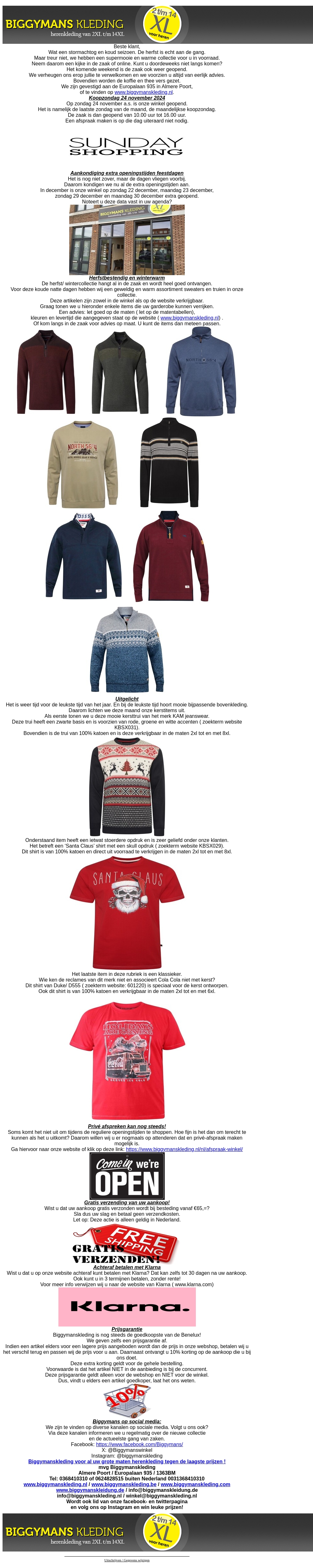 Ontdek de nieuwste herfst- en wintermode bij Biggymans Kleding. Geniet van koopzondag op 24 november en profiteer van gratis verzending! Bekijk onze comfortabele en stijlvolle herenkleding, speciaal ontworpen voor grote maten. Mis het niet en bezoek ons voor de beste deals en de nieuwste mode.