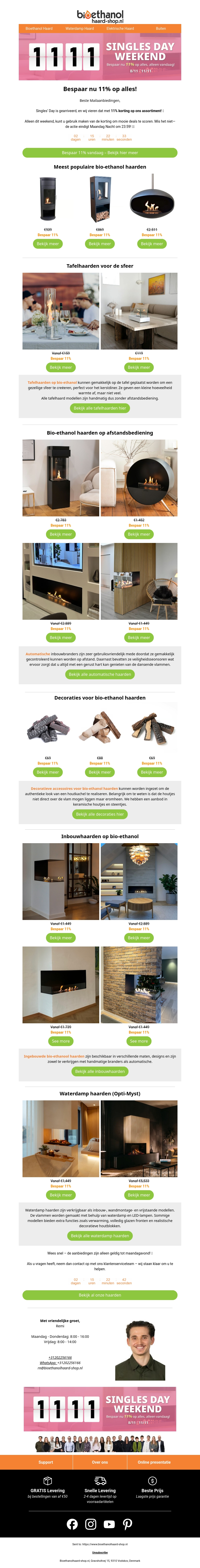 Vier Singles Day met geweldige kortingen tot 11% op al onze bio-ethanol haarden. Deze aanbieding is geldig tot maandag, dus zorg ervoor dat je snel bent. Ontdek onze populaire bio-ethanol haarden en tafelhaarden voor meer sfeer in huis. Of je nu op zoek bent naar een inbouwhaard of een waterdamp haard, wij hebben alles wat je nodig hebt. Mis deze kans niet om te besparen!