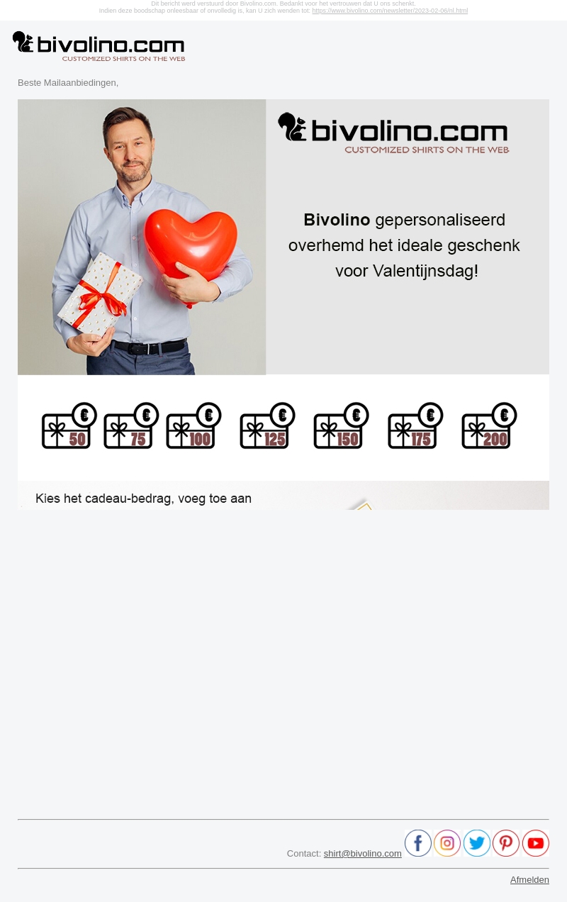 Geef een uniek en op maat gemaakt overhemd als cadeau voor Valentijnsdag. Bivolino biedt gepersonaliseerde shirts die speciaal zijn ontworpen om indruk te maken. Met verschillende cadeaubonbedragen is het eenvoudig om een keuze te maken. Ontdek hoe je dit persoonlijke geschenk kunt creëren en bestellen.